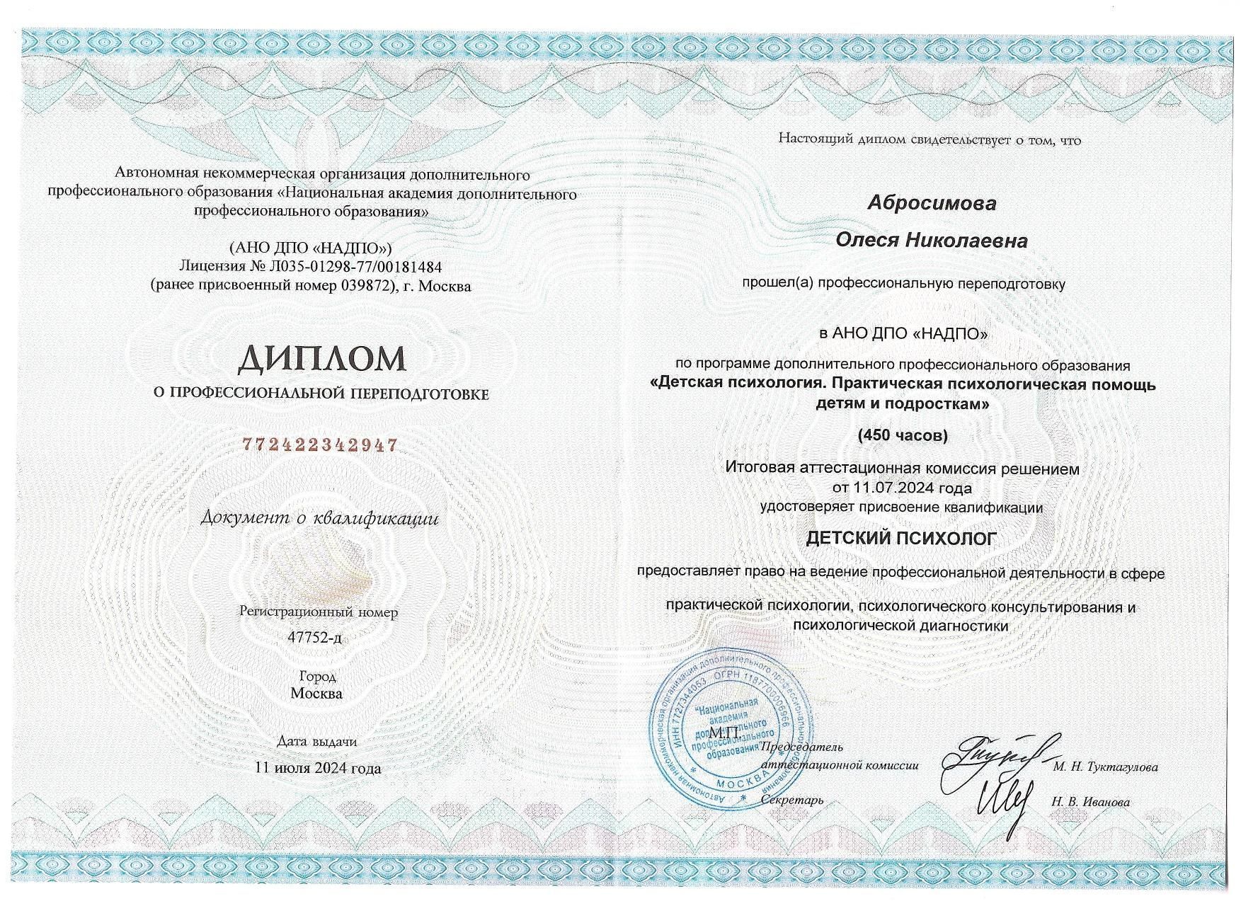 В 2024 окончила «Национальную академию дополнительного профессионального образования» по программе: «Детская психология. Практическая психологическая помощь детям и подросткам» Квалификация: Детский психолог
