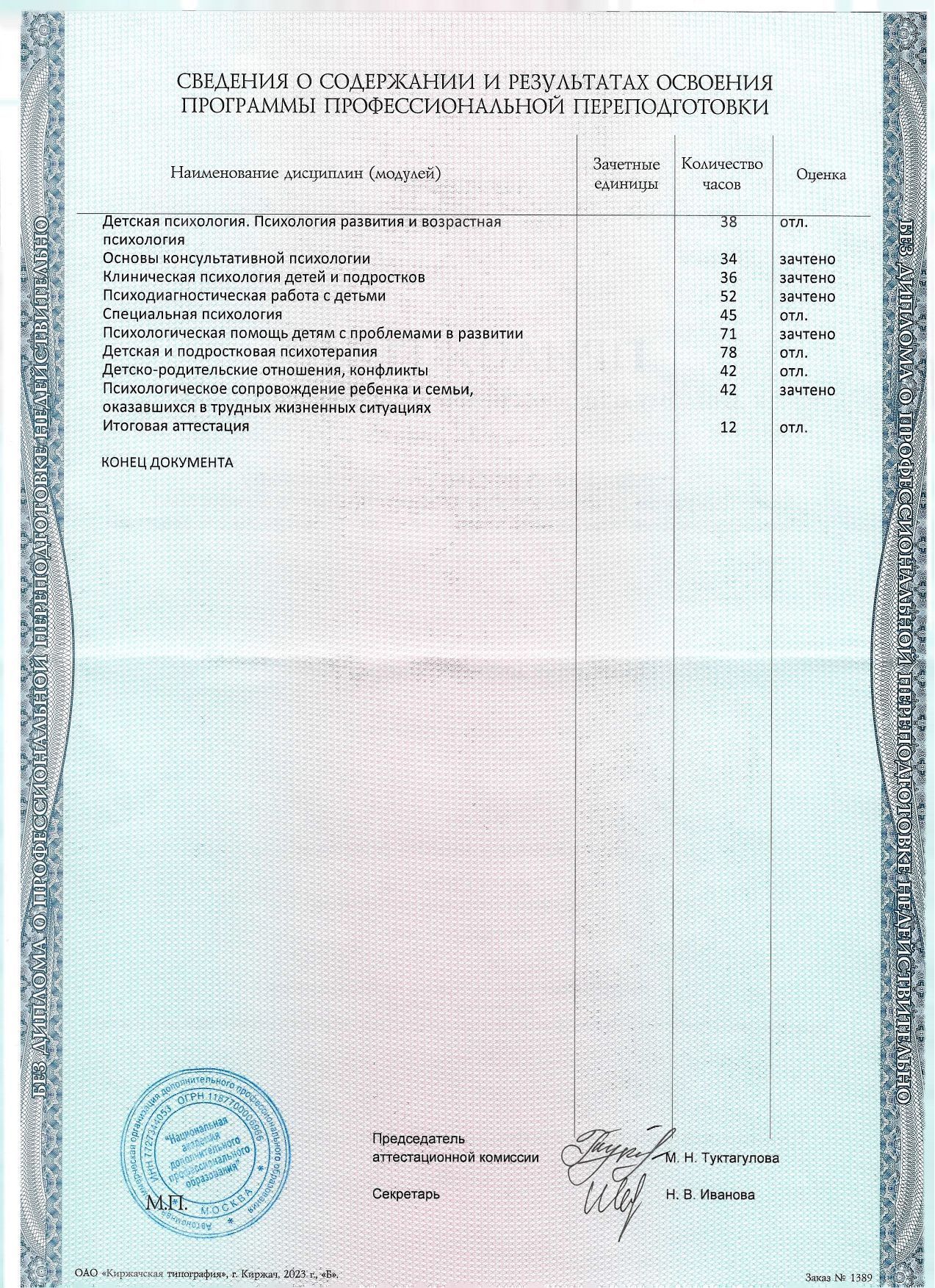 В 2024 окончила «Национальную академию дополнительного профессионального образования» по программе: «Психолого-педагогическое сопровождение образовательного процесса. Нейропсихологическая диагностика и коррекция в детском возрасте» Квалификация: Специалист по нейропсихологической диагностике и коррекции в детском возрасте