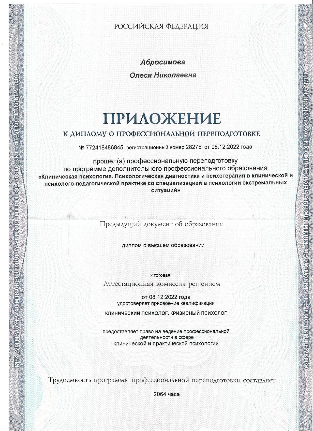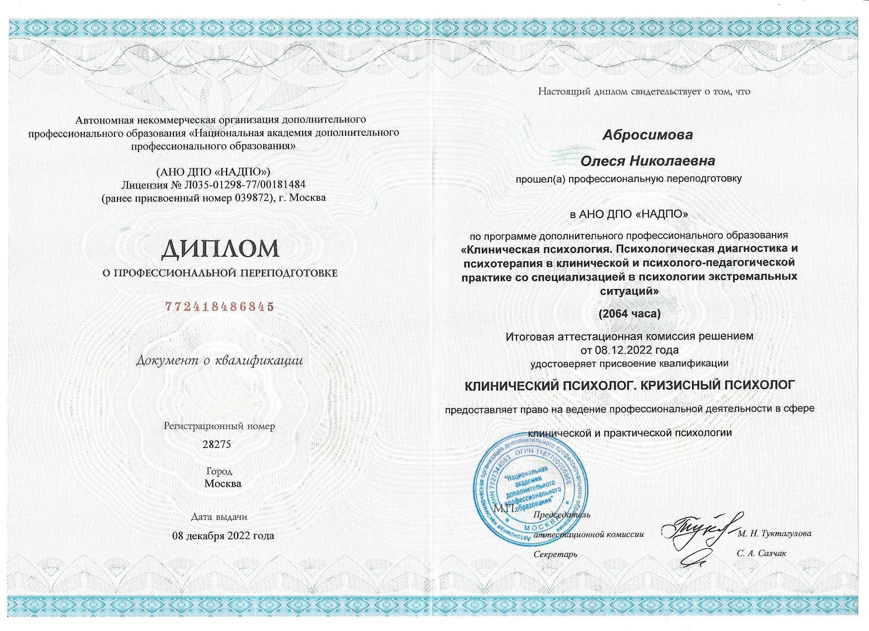 В 2022 окончила «Национальную академию дополнительного профессионального образования» по программе: «Клиническая психология. Психологическая диагностика и психотерапия в клинической и психо-педагогической практике со специализацией в психологии экстремальных ситуаций» Квалификация: Клинический психолог. Кризисный психолог